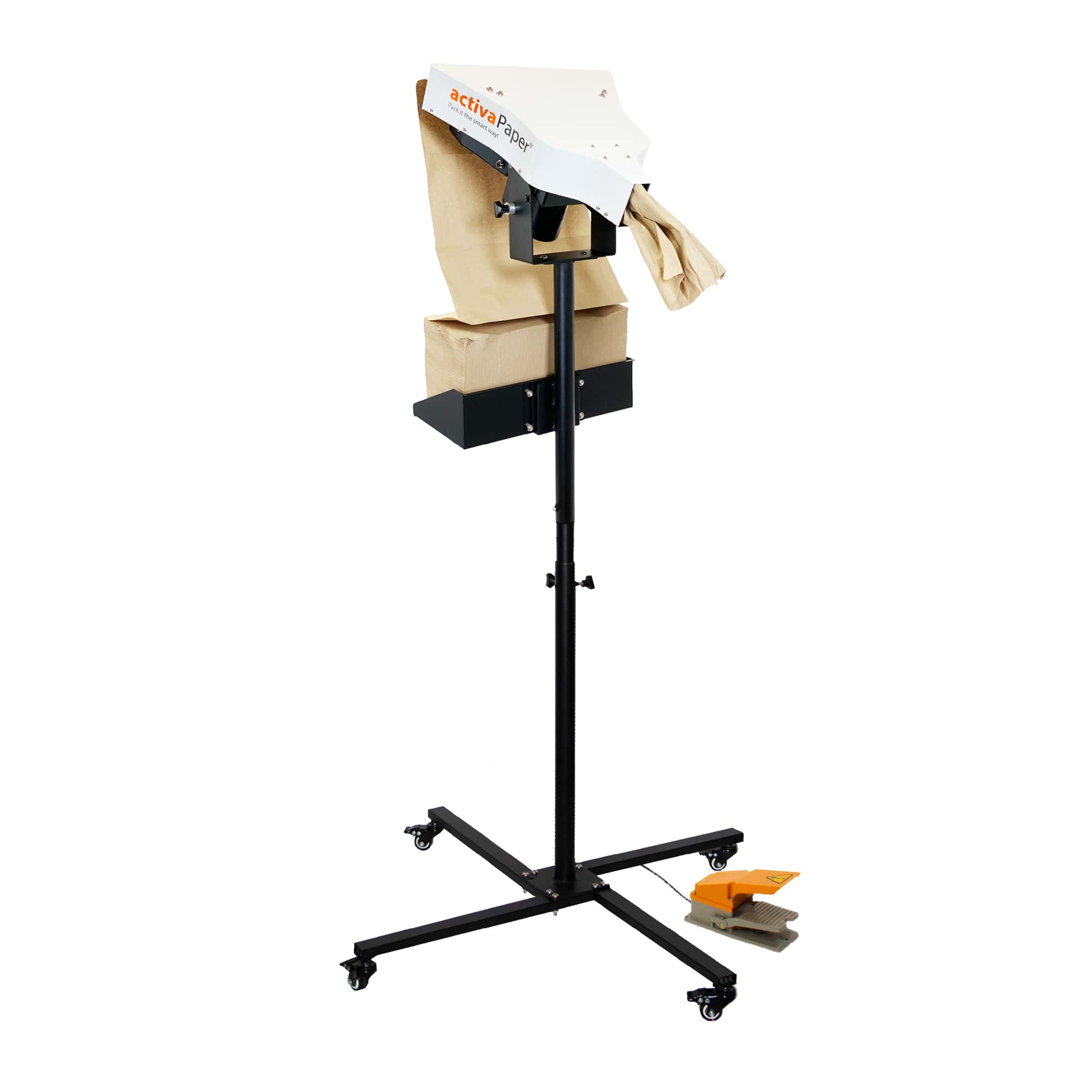 Nopea ja helppokäyttöinen paperitäytekone pahvilaatikoiden täyttämiseen ja tuotteiden suojaamiseen. Lattiapoljinta painamalla paperitäytekone täyttää alla olevan laatikon ja perforoidun laskospaperin ansiosta paperin saa helposti revittyä irti.